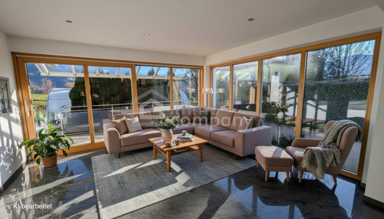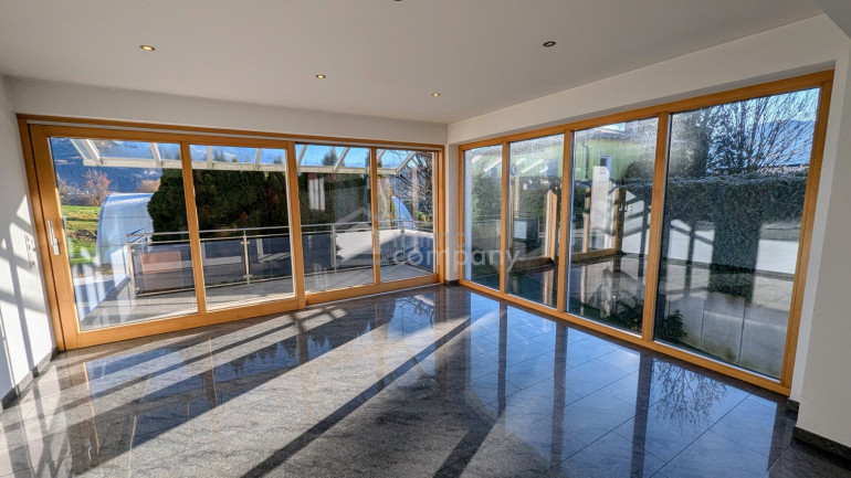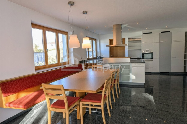 Das Herzstück des Hauses stellt der Wohn- und Essbereich dar und die Küchenlodge mit separierter Wirtschaftskammer und den hochwertigen Geräten sowie der modernen Ausstattung machen das Kochen zum richtigen Vergnügen. Die Fensterfronten leiten den Blick immer wieder ins Grüne mit endlos atemberaubender Sicht auf die freie Landschaft und die Berge.