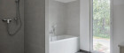 Dielenboden, Fliesen, Parkett, Wohnküche / offene Küche, Bad mit Fenster, Badewanne, Dusche, Parkplatz