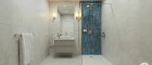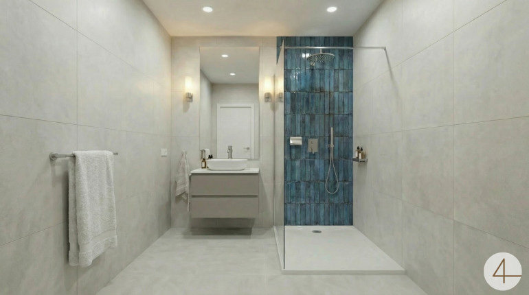 Design-Eyecatcher: Metro-Designerfliesen in Grün/Blau an der Dusch- und WC-Rückwand