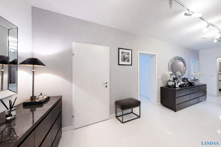 Besonderer Eyecatcher: der hochwertige, glänzende weiße Gussboden. Minimalistisch, elegant, außergewöhnlich. Ein Boden, der Räume größer, heller und luxuriöser wirken lässt.