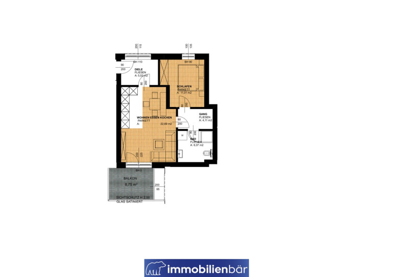 Vorraum, Schlafzimmer, Bad mit Dusche, WC, Wohn-, Ess-, Küchenbereich mit Ausgang auf den Balkon. 1.OG, 49,40m² Wohnfläche mit 8,75m² Balkon. Inklusive 1 Kellerabteil und 1 Außenparkplatz.