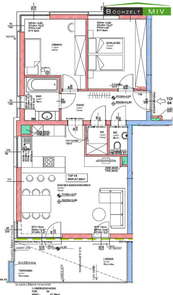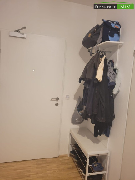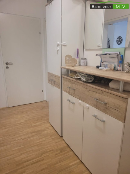 Die Wohnung hat eine Größe von ca. 74,97 m² und teilt sich wie folgt auf: Vorraum, Küche mit Wohn-/Essbereich und Ausgang auf den Balkon, zwei Schlafzimmer, Badezimmer mit Wanne und Fenster, separates WC und ein Abstellraum. Weiters sind der Wohnung ein Kellerabteil und ein Carportplatz zugeteilt.