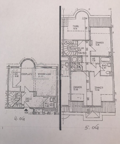 5. Stock: Diele, Dusche mit WC, Badezimmer mit Wanne, 3 Zimmer (derzeit WG Zimmer), Abstellraum, Dachterrasse