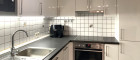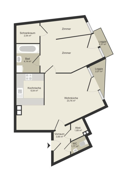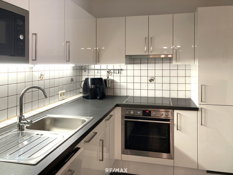 Wohnküche mit Zugang zur 1. Loggia: Ein offener und einladender Raum, der Wohnen, Essen und Kochen vereint. Die abgeteilte Küche ist mit einer modernen, weißen Einbauküche und allen notwendigen Geräten (inkl. Herd, Backofen, Spüle) ausgestattet. Der Essbereich bietet Platz für gemeinsame Mahlzeiten.
