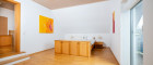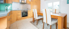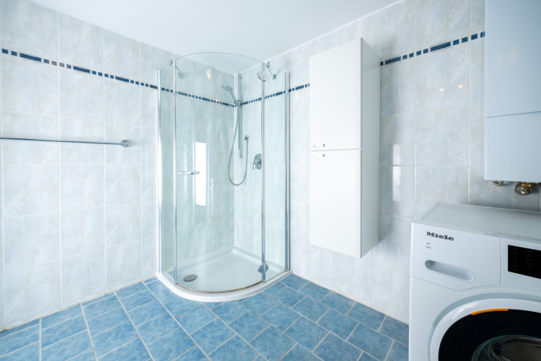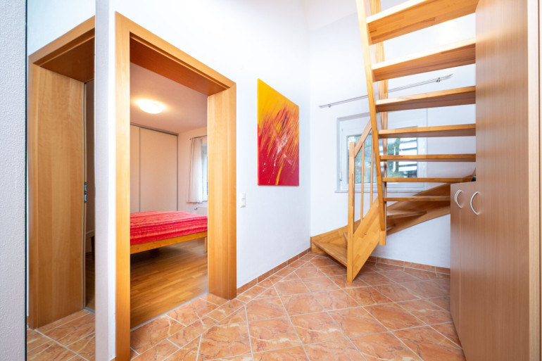Im Erdgeschoss empfängt Sie ein freundlicher Vorraum, von dem aus Sie rechterhand sowohl das Badezimmer als auch das separate WC erreichen – beide mit Tageslichtfenster, was für eine angenehme, natürliche Belichtung sorgt. Direkt im Anschluss gelangen Sie in die einladend helle Küche, die nach Süden ausgerichtet ist und mit einer praktischen L-förmigen Einbauküche ausgestattet wurde. Diese drei Räume haben eine etwas geringere Raumhöhe von ca. 2,10 m, da sie Teil eines früheren Wirtschaftsgebäudes sind, das vor dem finalen Ausbau im Jahr 2008 umgebaut wurde.