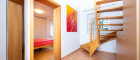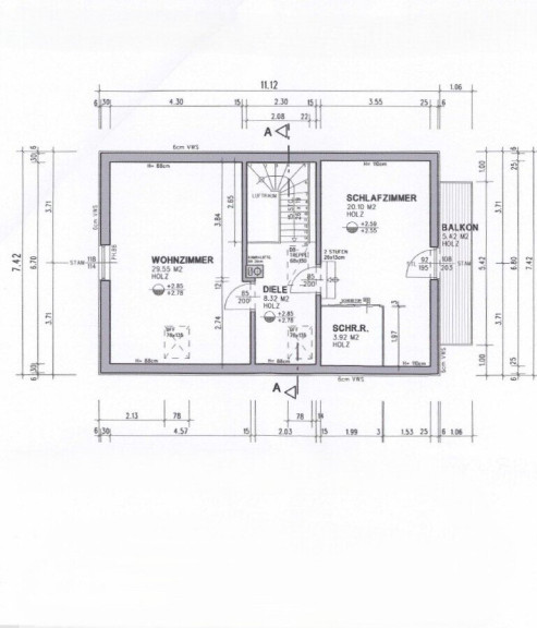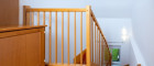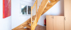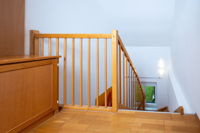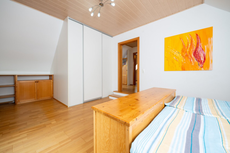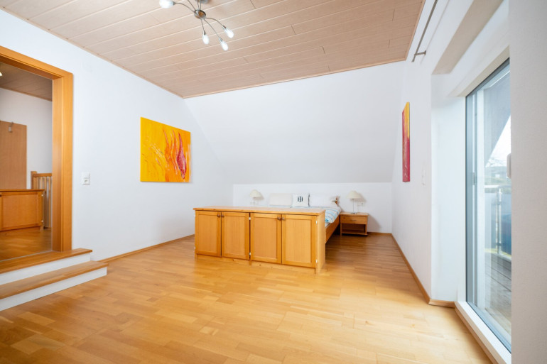 Über eine schöne Holztreppe gelangen Sie in das Obergeschoss, das durch großzügige Raumverhältnisse besticht. Hier finden Sie ein großes Wohnzimmer mit fast 30 m² sowie ein Schlafzimmer mit integriertem Schrankraum. Das Schlafzimmer liegt direkt über der Küche und weist als einziges Zimmer eine Raumhöhe von ca. 2,70 m auf.