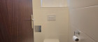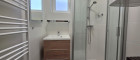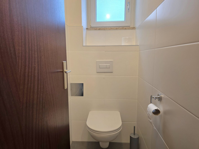 Das Badezimmer ist mit einer Dusche und Fenster ausgestattet und ist vom WC getrennt.