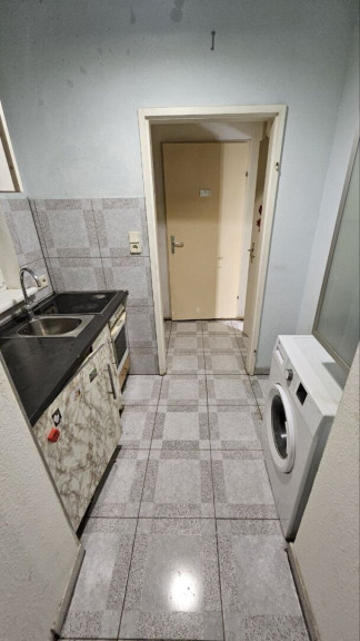 • Offene Küchennische mit Einbauküche (Kühlschrank, Backofen, Kochfeld, Spüle) und Waschmaschine
