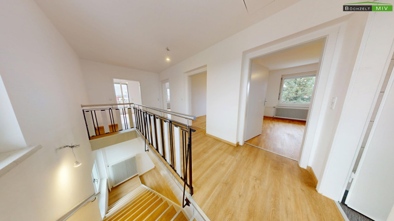 Das Kellergeschoss mit knapp 63,73 m² lässt sich von einer Innenstiege erreichen.Dort befindet sich neben diversen Lager- und Kellerräumlichkeiten auch der ehemalige Heizraum mit dahinterliegendem Brennstofflagerraum, sowie im Hauptbereich des Kellers auch die derzeitige Haustechnik (Fernwärmeübernahmestation, Warmwaserboiler, sowie neuer Elektroverteiler). Das Erdgeschoss mit seinen knapp 64,98 m² besteht aus dem Windfang, einem Vorraum, einem sanierten Badezimmer samt Dusche und WC, einem geräumigen Wohnzimmer von dem man auf die knapp 12,8 m² Terrasse gelangt, sowie einem geräumigen Esszimmer mit dahinterliegender, halboffener Küche. Hinter der Küche im Außenbereich besteht ein kleiner, ca. 5,5 m² großer Balkon, der allerdings nur von außen begangen werden kann. Im Dachgeschoss mit seinen knapp 67,36 m², befinden sich insgesamt 4 Schlafzimmer, ein Vorraum, sowie ein weiteres saniertes Badezimmer mit moderner Walk-In-Dusche und WC. Vom südseitigen Schlafzimmer gelangt man auf einen weiteren, ca. 4,56 m² großen Balkon.
