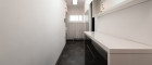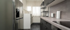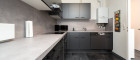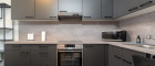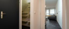 Beim Betreten der Wohnung gelangt man in einen hellen Vorraum, der ausreichend Platz für Garderobe und Schuhe bietet. Linkerhand befindet sich die großzügige Küche, die auch Platz für einen Side-by-Side-Kühlschrank bietet.
