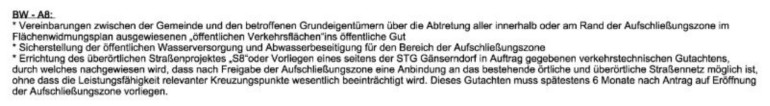 - !!! WICHTIG !!! Bausperre ist keine vorhanden, jedoch befinden sich die beiden Grundstücke unter dieser EZ in einer Aufschließungszone (BW-A8) – siehe dazu die Aufhebungsbedingungen im Anhang, zusätzlich wurde vereinbart, dass die Aufschließungszone BW-A8 erst dann geöffnet werden kann, wenn zumindest 50 % Baubewilligungen bei der Aufschließungszone BW-A9 vorliegen (bisher gibt es dort noch keine Baubewilligungen – diese Aufschließungszone ist ebenfalls noch nicht aufgehoben) !!! WICHTIG !!!