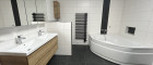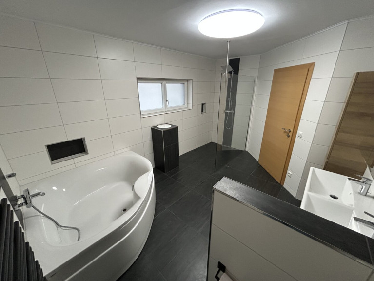 Die moderne Einbauküche ist ein Highlight für jeden Hobbykoch und lässt keine Wünsche offen. Sie bietet genügend Platz, um auch bei größeren Familienfeiern kulinarische Köstlichkeiten zuzubereiten. Die beiden Bäder, eines davon mit Fenster, sind stilvoll gestaltet und bieten sowohl eine Badewanne als auch eine Dusche – hier bleibt kein Wunsch offen, wenn es um Entspannung und Hygiene geht.