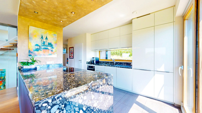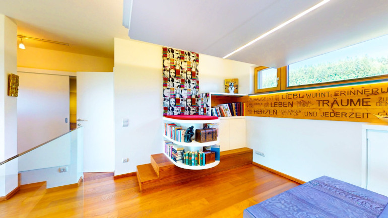 Das Obergeschoss öffnet sich zu einem großzügigen Büro mit weitem Ausblick und indirekter Beleuchtung — ideal für anspruchsvolle Home-Office-Nutzer (Büro im Haus, Home-Office Maria Saal). Gegenüber befindet sich eine offene Empore mit Klavierbereich; die akustische Offenheit macht das Haus zur idealen Wahl für Musizierende (Empore, Haus mit Musikzimmer). Im Südosten: zwei Zimmer mit angeschlossenem Bad (Kinderzimmer mit Bad). Am Nordostflügel liegen Elternschlafzimmer, Ankleide und ein großzügiges Badezimmer mit Wanne und Dusche; Badezimmer und Nassbereiche sind mit großformatigem Feinsteinzeug in warmen Tönen ausgestattet. Alle Wohn- und Schlafräume im Obergeschoss (außer Bäder/WC) sind mit Eichenparkett ausgelegt. Das Treppenhaus besticht durch ein randloses Glasgeländer, das Großzügigkeit und moderne Ästhetik unterstreicht (Glasgeländer Treppe).