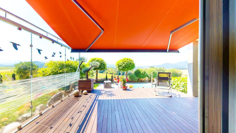 Der fließende Übergang zwischen Küche, Esszimmer und Wohnzimmer schafft ein offenes Wohngefühl; große, bodentiefe Fenster vermitteln den Eindruck, im Grünen zu sitzen (offener Wohnbereich, Wohnzimmer mit Panoramafenster). Vom Esszimmer reicht die Aussicht bis zu den Karawanken (Aussicht Kärnten). Wohnzimmer und Essbereich sind mit Eichenparkett ausgelegt; das Wohnzimmer wird durch einen modernen weißen Eckkamin ergänzt. Über die bodentiefen Fenster gelangt man direkt auf die Terrasse (Patio/Terrasse 36,54 m²) — überdachter Sitzplatz und Sonnendeck mit elektrisch ausfahrbarer Markise; Terrasse, Carport und Eingangsbereich sind mit edlen Bangkirai-Holzdielen belegt (Terrasse Bangkirai, Carport Holzdeck).
