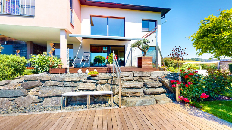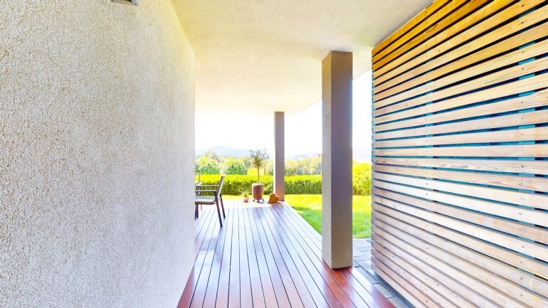 Hochwertige Internorm-Fenster (Internorm Fenster), Bangkirai-Terrassenbelag, Eichenparkett (Eichenholzparkett)