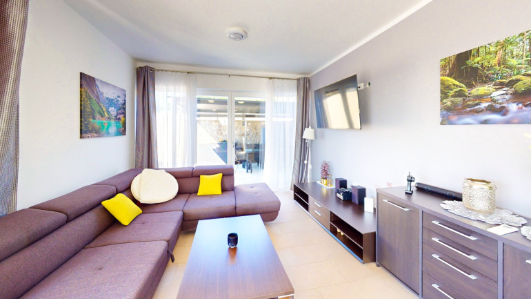Der helle, offene Wohnbereich bildet das Herzstück der Wohnung. Hier treffen Komfort, geselliges Beisammensein und stilvolle Einrichtung aufeinander. Durch große Türen gelangen Sie direkt in den privaten Außenbereich – das perfekte Zusammenspiel aus Innen- und Außenleben.