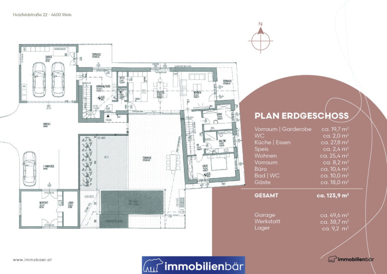 - Garage (ca. 49,6 m²) und Nebengebäude mit Werkstatt und WC (ca. 38,7 m²)