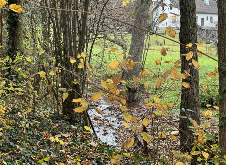 Das 952 m² große Grundstück zeigt sich nicht geschniegelt, sondern wildromantisch. Der Garten darf wachsen, sich entfalten und ein bisschen seinen eigenen Kopf haben. Er grenzt an ein kleines Bächlein und bietet viel Platz für alle, die Natur lieber lebendig als perfekt gestutzt mögen. Ein Pool und ein Gewächshaus sind vorhanden – Zeichen dafür, dass hier immer schon gern draußen gelebt wurde.