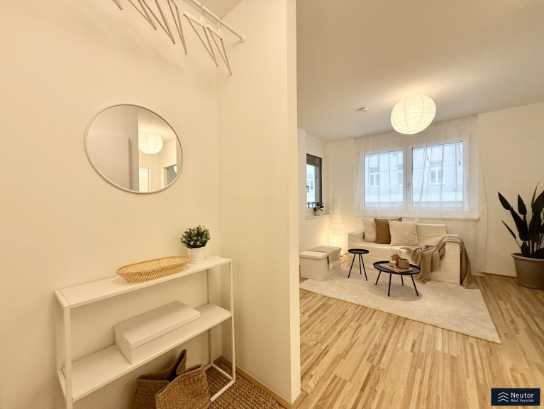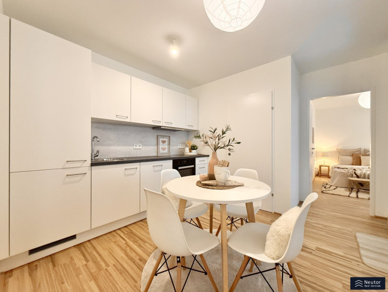 Diese stilvolle Wohnung überzeugt durch eine durchdachte Raumaufteilung, hochwertige Materialien und ein modernes Wohnambiente. Beim Betreten empfängt Sie ein einladender Vorraum, der ausreichend Platz für Garderobe und Stauraum bietet. Rechtsbefindet sich ein separates WC mit Handwaschbecken – praktisch für Gäste und den Alltag. Geradeaus öffnet sich der lichtdurchflutete Wohnbereich, der Küche, Essplatz und Wohnzimmer harmonisch vereint. Hier entsteht ein offener, freundlicher Raum, der sowohl zum Entspannen als auch zum geselligen Beisammensein einlädt. Vom Wohnzimmer aus gelangen Sie direkt auf die überdachte Loggia – ein geschützter Freiraum, der zum Verweilen im Freien einlädt, ganz gleich bei welchem Wetter. Das Schlafzimmer, das ebenfalls direkt vom Wohnzimmer aus begehbar ist, bietet nicht nur angenehme Ruhe, sondern verfügt auch über ein eigenes, modernes En-Suite-Badezimmer mit Dusche – ideal für zusätzlichen Komfort und Privatsphäre. Mit ihrer klaren Raumaufteilung, den hochwertigen Ausstattungsdetails und der hellen Wohnatmosphäre ist diese Wohnung ein Zuhause, das durch Stil und Funktionalität gleichermaßen überzeugt. Ein Wohntraum für Singles, Paare oder alle, die modernes Wohnen mit cleverem Grundriss schätzen!