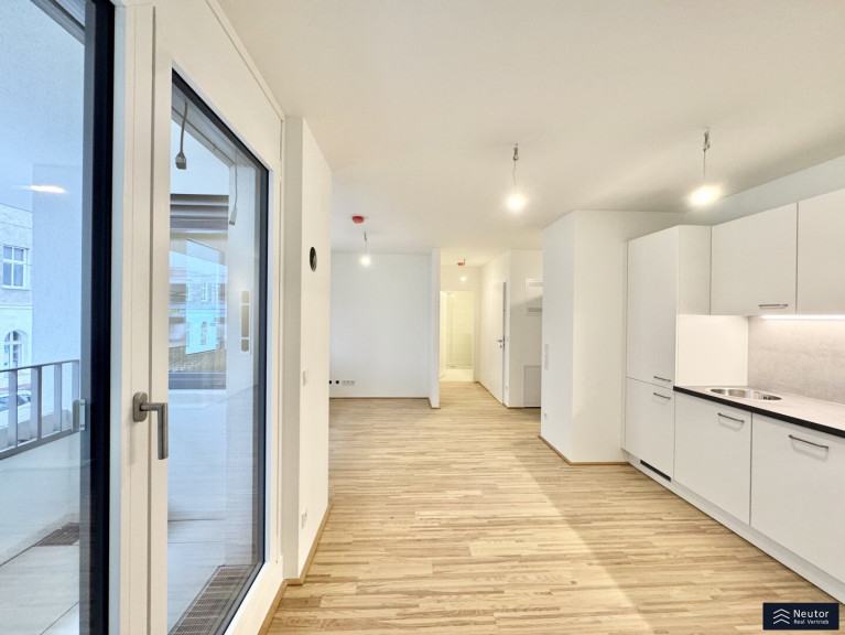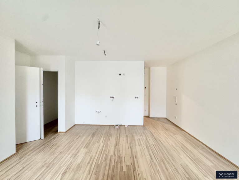 Diese stilvolle Wohnung überzeugt durch eine durchdachte Raumaufteilung, hochwertige Materialien und ein modernes Wohnambiente. Beim Betreten empfängt Sie ein einladender Vorraum, der ausreichend Platz für Garderobe und Stauraum bietet. Rechtsbefindet sich ein separates WC mit Handwaschbecken – praktisch für Gäste und den Alltag. Geradeaus öffnet sich der lichtdurchflutete Wohnbereich, der Küche, Essplatz und Wohnzimmer harmonisch vereint. Hier entsteht ein offener, freundlicher Raum, der sowohl zum Entspannen als auch zum geselligen Beisammensein einlädt. Vom Wohnzimmer aus gelangen Sie direkt auf die überdachte Loggia – ein geschützter Freiraum, der zum Verweilen im Freien einlädt, ganz gleich bei welchem Wetter. Das Schlafzimmer, das ebenfalls direkt vom Wohnzimmer aus begehbar ist, bietet nicht nur angenehme Ruhe, sondern verfügt auch über ein eigenes, modernes En-Suite-Badezimmer mit Dusche – ideal für zusätzlichen Komfort und Privatsphäre. Mit ihrer klaren Raumaufteilung, den hochwertigen Ausstattungsdetails und der hellen Wohnatmosphäre ist diese Wohnung ein Zuhause, das durch Stil und Funktionalität gleichermaßen überzeugt. Ein Wohntraum für Singles, Paare oder alle, die modernes Wohnen mit cleverem Grundriss schätzen!