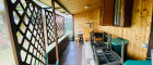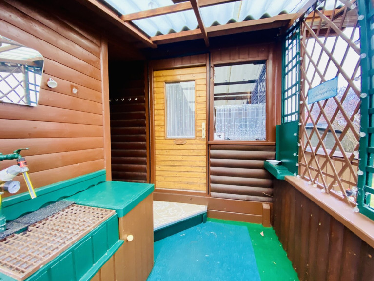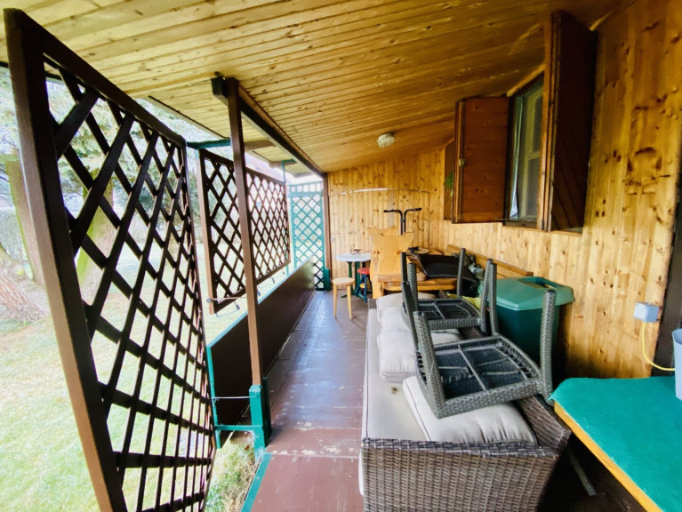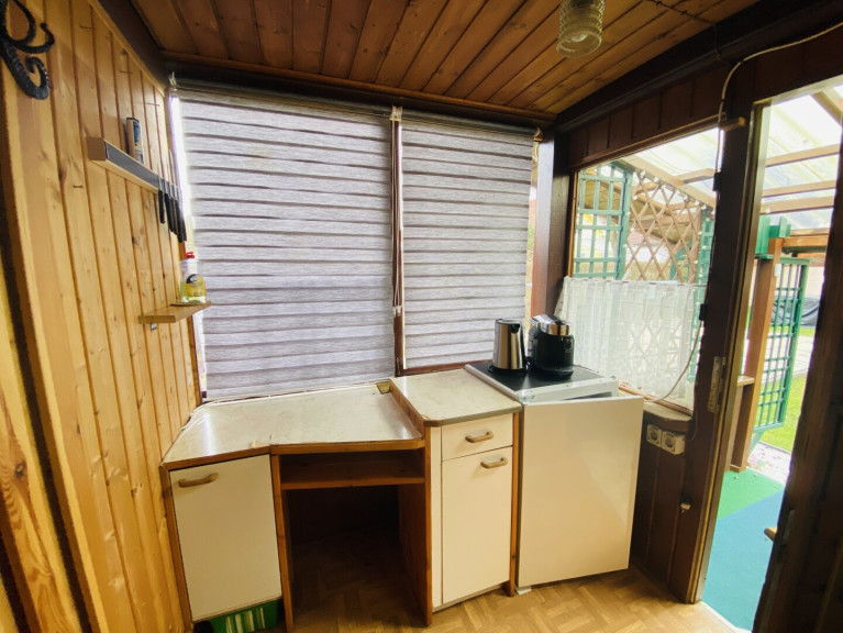 Das Gartenhaus verfügt über einen kleinen Vorraum, eine gemütliche Stube mit Schlafgelegenheit, einen kleine geschlossene Veranda, ein WC mit Waschbecken (nicht frostsicher) sowie einen Erdkeller. Zusätzlich gibt es eine voll ausgestattete Werkstatt mit separatem Eingang. Strom ist im gesamten Gartenhaus vorhanden, der Stromzähler befindet sich in der Werkstatt. Kanal- und Wasseranschluss sind ebenfalls vorhanden (nicht frostsicher).