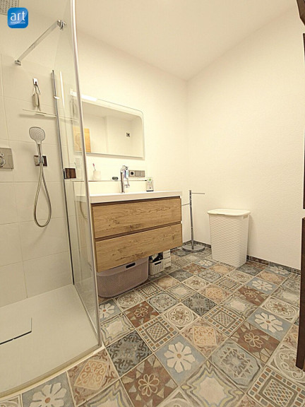 BAD: geschmackvoll gestaltet, Boden gefliest.
