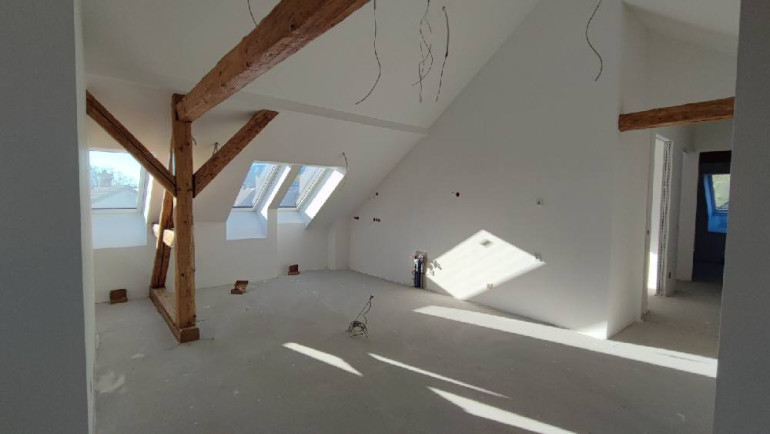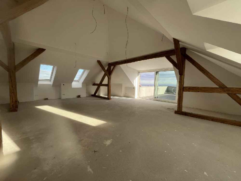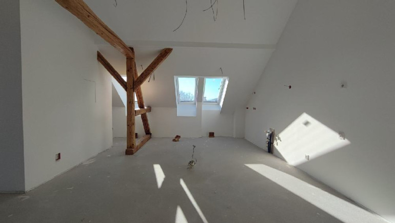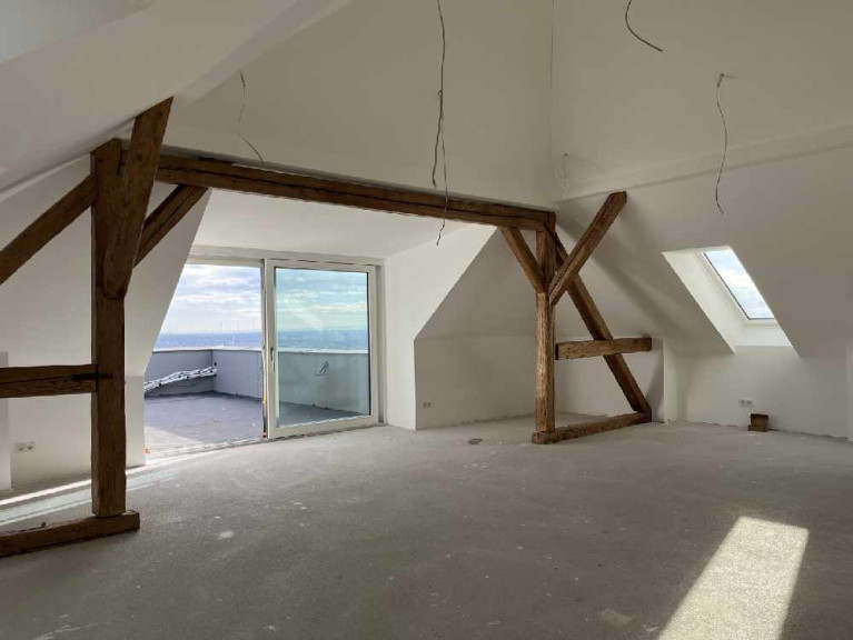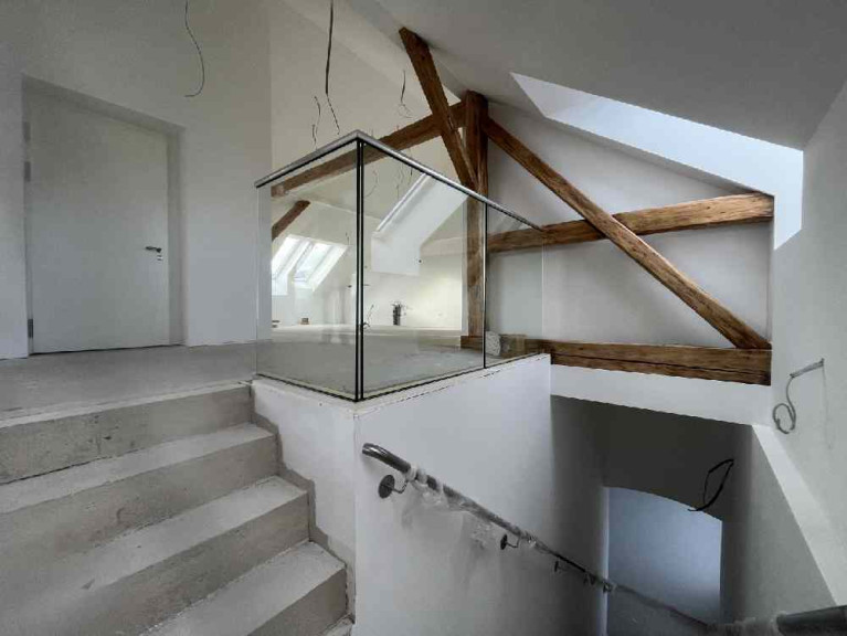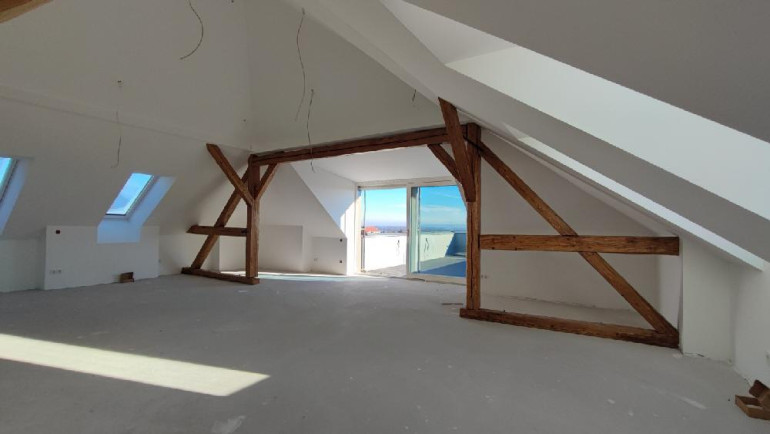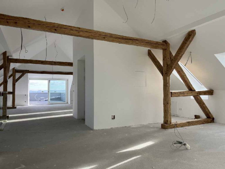 Das Penthouse befindet sich im obersten Geschoss des ehemaligen Winzerhauses und ist vollständig neu ausgebaut – mit besonderem Augenmerk auf den Erhalt historischer Bauelemente.
