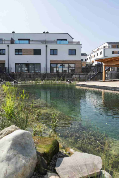 Um dieses Wohngefühl zu erzielen, war für uns besonders wichtig, dass sich die Architektur der einzelnen Häuser nahtlos in die Natur einfügt. Erreicht haben wir das unter anderem durch die teilweise Holzverkleidung der Gebäude und Begrünung der Dachflächen.