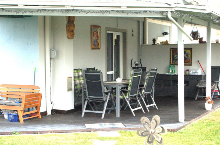 EG: Vorraum, kleines Bad + WC, Wohnzimmer mit offenem Küchenbereich und Ausgang auf die überdachte Terrasse, wo Sie auch an regnerischen warmen Tagen gemütlich sitzen können.