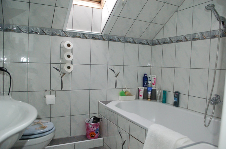 OG: Vorraum, 3 Zimmer, Bad (Wanne) + WC.