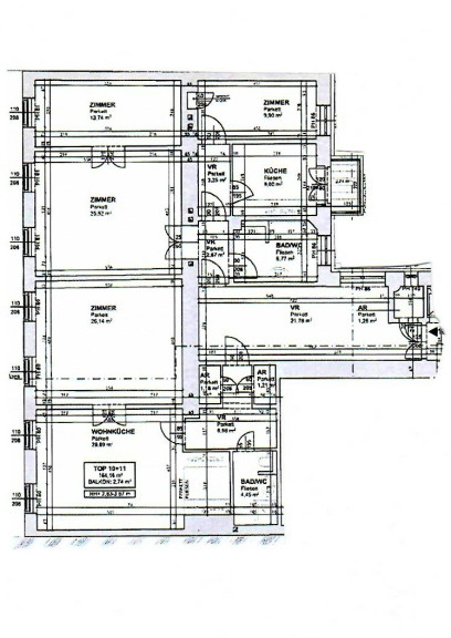 Vorzimmer, 4 Zimmer, Wohnküche, Extraküche, ca. 3 m2 Balkon, 2 Bäder mit WC, separates WC, 3 Abstellräume