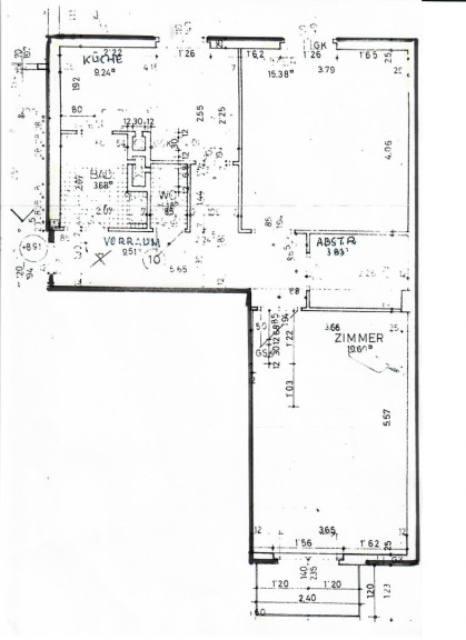 Vorzimmer, Wohnzimmer, ca. 2,40 m2 Balkon, Schlafzimmer, Extraküche, 2er-WG-geeignet, Badezimmer, WC, Abstellraum + Kellerabteil