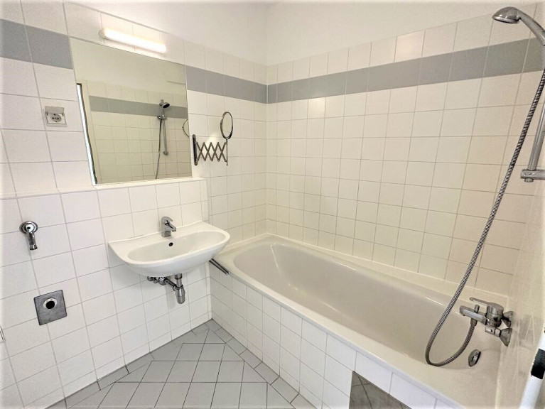 + Badezimmer mit Badwanne, Waschtisch und Waschmaschinenanschluss
