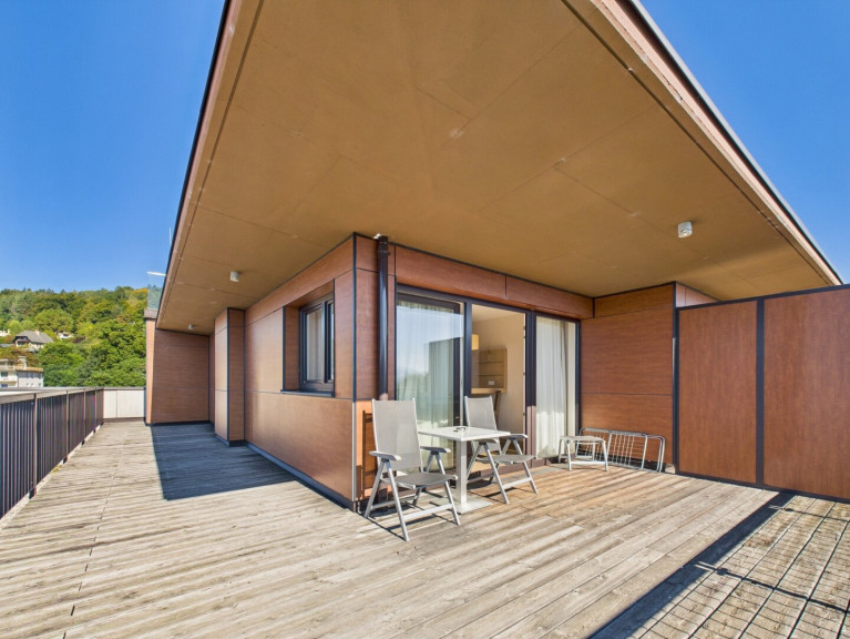 Besonders hervorzuheben ist die großzügige Terrasse – ein wahrer Rückzugsort mit traumhaftem Panoramablick über den See und die umliegende Natur.