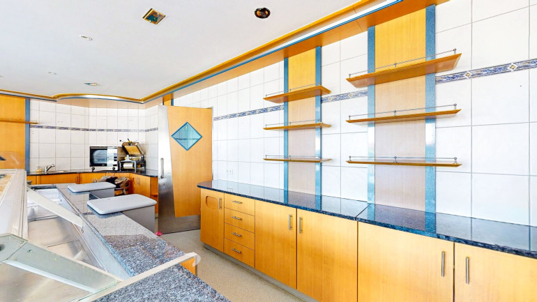 Die Raumaufteilung unterstützt eine effiziente Organisation: Kundenfluss, Warenpräsentation und Kassiervorgänge lassen sich optimal gestalten. Die Thekenanlage ist perfekt für die Präsentation von Wurst, Käse, Backwaren, Feinkost, Antipasti, Salaten oder fertig portionierten Speisen.