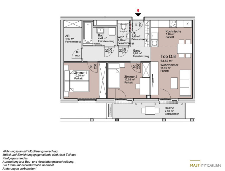 Die Wohnung befindet sich im 1. Liftstock und verfügt über 63,52 m² Wohnfläche + einen 7,80 m² großen Balkon.