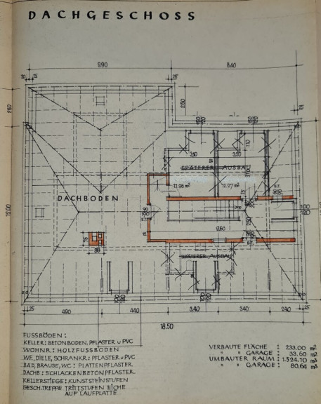 DG: Das Dachgeschoß gliedert sich in einen ausgebauten und in einen unausgebauten Teil, der aber aufgrund der guten Substanz leicht adaptiert werden kann. Der ausgebaute Bereich umfasst ca. 80m², von denen rund 55m² in Form von 2 Zimmern samt Bad und WC sehr gut nutzbar sind.