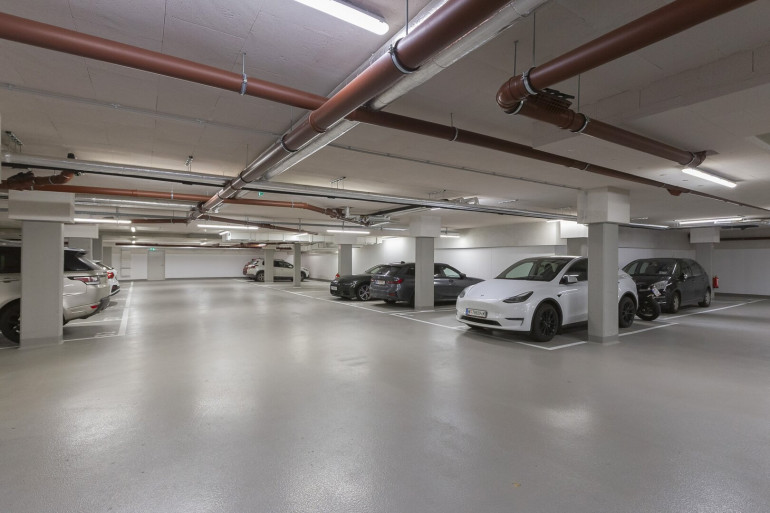 Fliesen, Parkett, Fernwärme, Fußbodenheizung, Wohnküche / offene Küche, Personenaufzug, Dusche, Garage