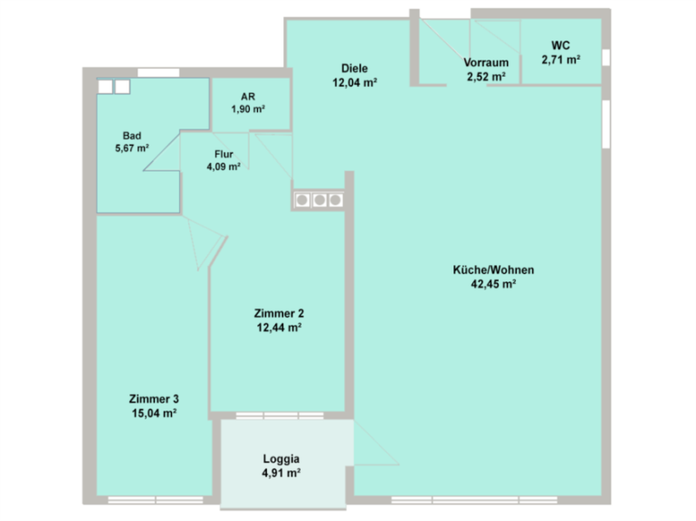 Die Wohnfläche beträgt ca. 99 m² und bietet den zukünftigen BewohnerInnen Vorraum, Diele, Flur, Abstellraum, separates WC, Bad mit Wanne und Dusche, Wohnraum mit Küche inkl. Einbaugeräten und 2 weitere Zimmer. Eine ca. 5 m² große Loggia sowie ein Kellerabteil sind ebenfalls im Angebot enthalten.