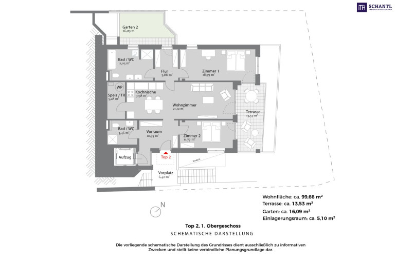 Zwei komfortable Schlafzimmer (ca. 18,79 m² und 11,17 m²), zwei moderne Bäder sowie ein Speis/Technikraum bieten praktischen Nutzen und viel Komfort im Alltag.