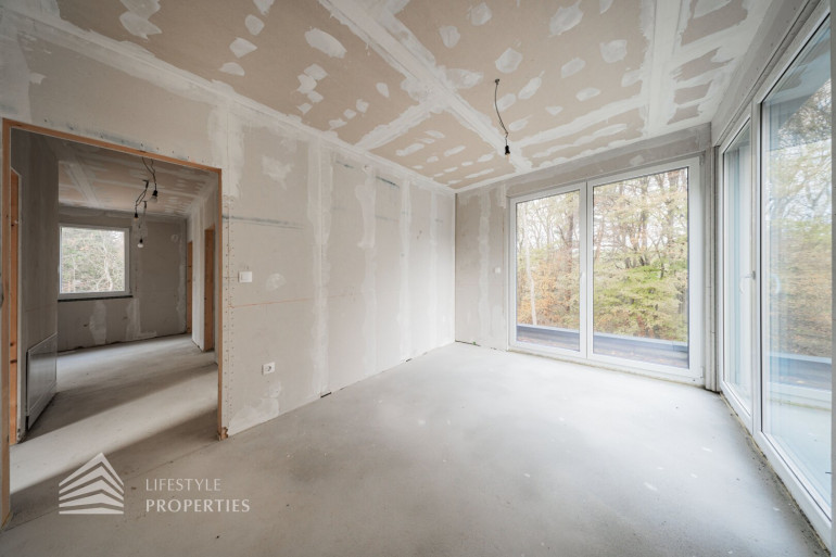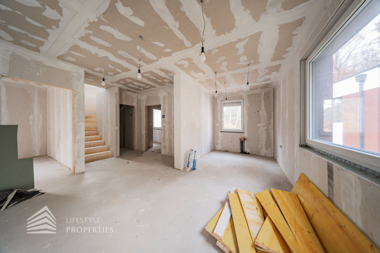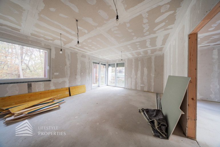 Beim Betreten des Hauses gelangen Sie in einen einladenden Vorraum. Rechts befindet sich ein Technikraum und ein Gäste-WC. Geradeaus öffnet sich ein lichtdurchflutetes Wohn-Esszimmer, wo eine traumhafte Küche Platz finden kann, mit direktem Zugang zur Terrasse und zu dem traumhaften Garten. Rechts liegt zudem ein Gästezimmer, das auch als Büro genutzt werden kann. Auf der rechten Seite führt eine Treppe ins Obergeschoss.