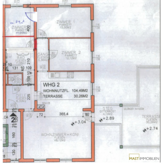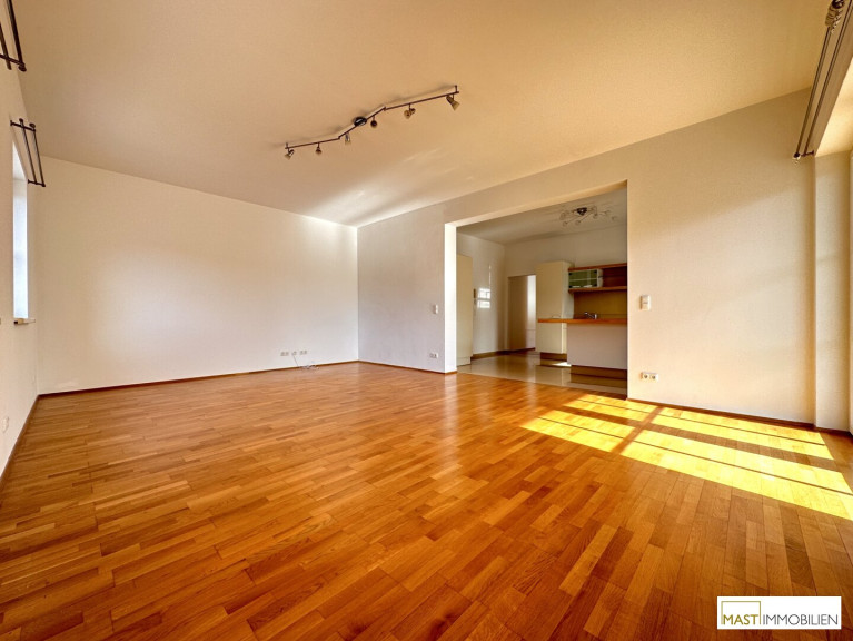 Die Wohnküche verfügt über eine Fläche von ca. 48 m² und ist mit einer Terrasse (ca. 30 m²) in südlicher Ausrichtung ausgestattet. Das Elternschlafzimmer verfügt über eine Fläche von 15 m² und bietet einen eigenen Schrankraum. Das 2. Schlafzimmer eignet sich optimal als Kinderzimmer und verfügt über eine Fläche von ca. 12 m².