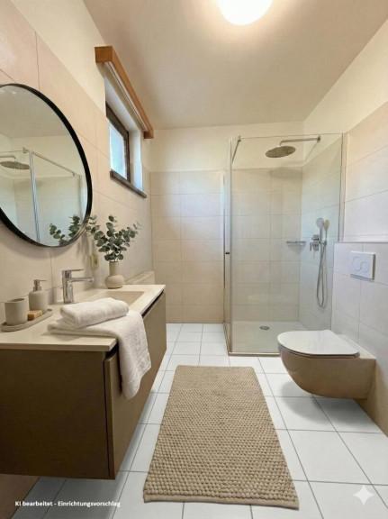 Raumaufteilung: Vorraum mit Ausgang auf die Terrasse, Bad (mit Badewanne, WC, Waschbecken, Heizkörper und Fenster) mit anschließendem Abstellraum, Zimmer, Essplatz, und Küche. Ebenso gehört ein Kellerabteil mit 2,47m² zur Wohnung.