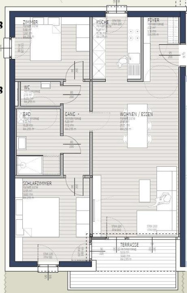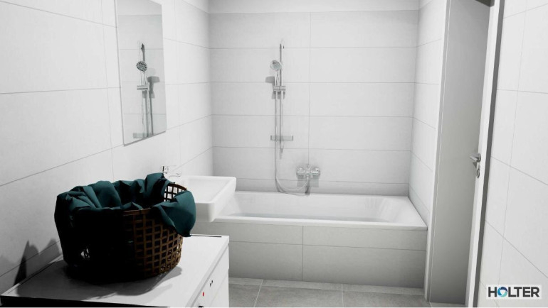 Die Wohnungen sind ideal für Paare und kleine Familien konzipiert. Der Vorraum bietet ausreichend Platz für eine Garderobe und führt direkt in den offenen Wohn- und Essbereich. Das Badezimmer und das separate WC sind großzügig geplant; auf Wunsch kann die Trennwand zwischen beiden entfernt werden. Die Küche bietet Raum für zwei Küchenzeilen und kann – je nach Bedarf – offen zum Wohnraum hin gestaltet werden. Hochwertige Materialien wie Feinsteinzeug oder Parkett im Küchenbereich sowie ein eleganter Eichenklebeparkett im Wohnraum unterstreichen die Qualität. Ein bodentiefes Fenster und eine Balkontür sorgt für einen hellen Wohnraum und direkten Zugang zur Terrasse oder Loggia.
