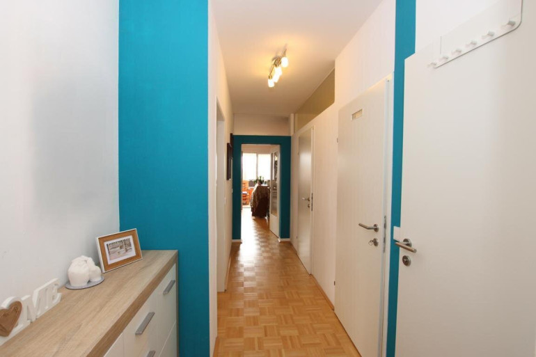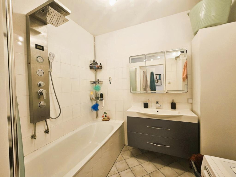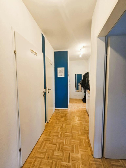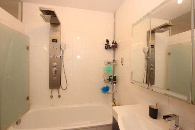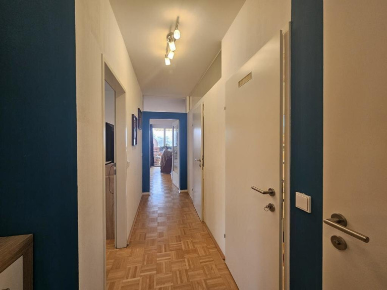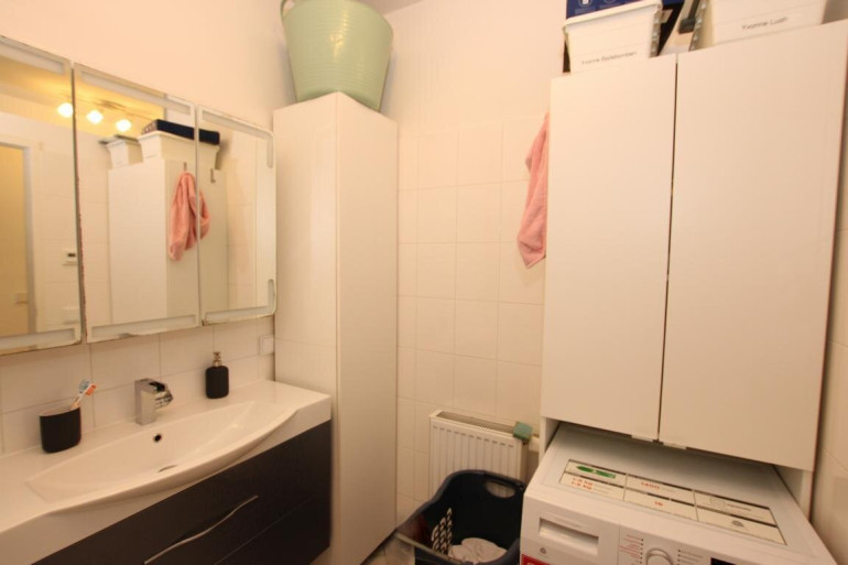 Das Badezimmer ist mit einer Badewanne ausgestattet, während die Toilette separat gehalten wurde. Ein praktischer Abstellraum sorgt für zusätzlichen Stauraum. Parkettböden und weiße Türen unterstreichen das moderne Wohnambiente. Die Wohnung verfügt zudem über Rollläden an den Fenstern sowie einen eigenen Tiefgaragenstellplatz und ein Kellerabteil.