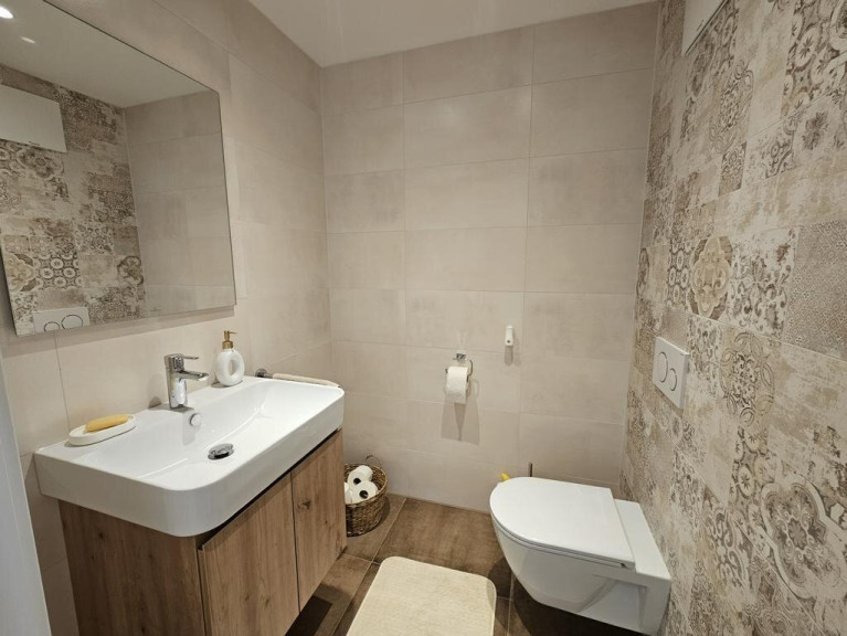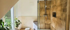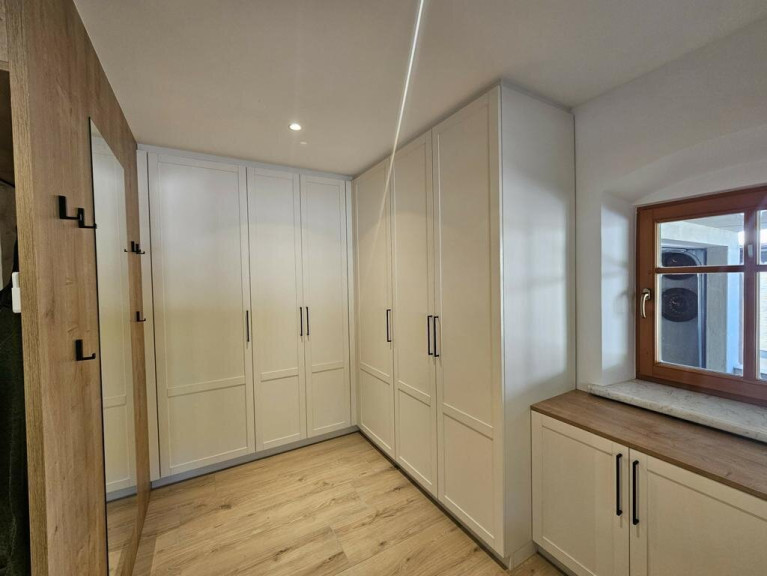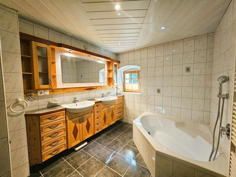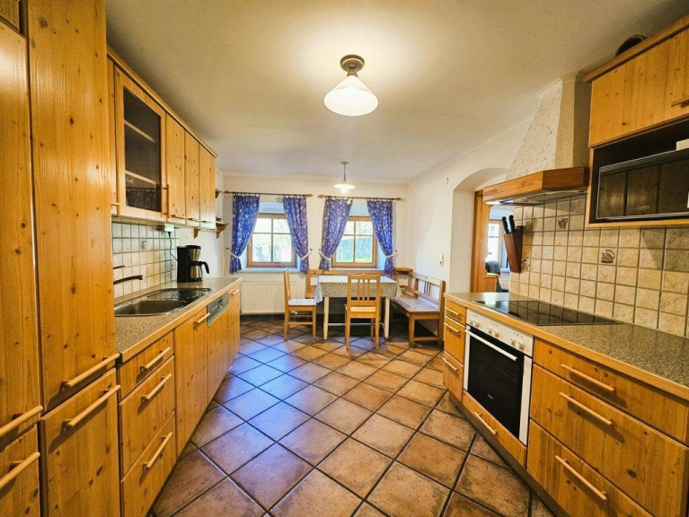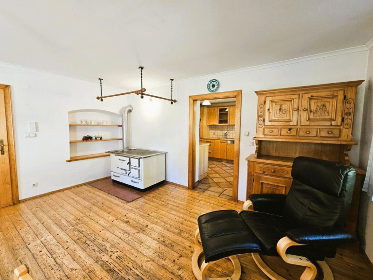 Im Erdgeschoss befindet sich eine eigenständige Wohneinheit mit rund 82 m² Wohnfläche. Sie umfasst eine gemütliche Stube, eine separate Küche, ein Badezimmer mit Dusche und Badewanne, ein kleines Schlafzimmer, eine Toilette sowie einen Lagerraum. Alle Zimmer sind mit Fußbodenheizung ausgestattet – mit Ausnahme der Stube, die mit einem traditionellen Tischherd den historischen Charakter des Hauses besonders hervorhebt.