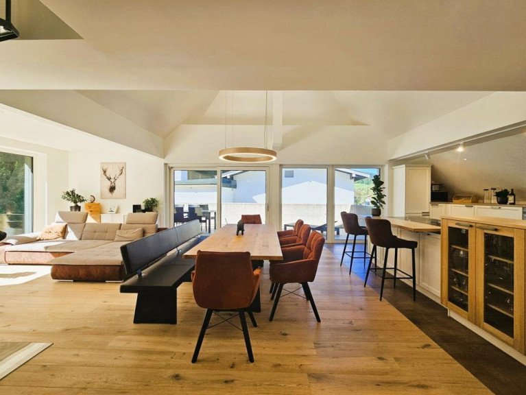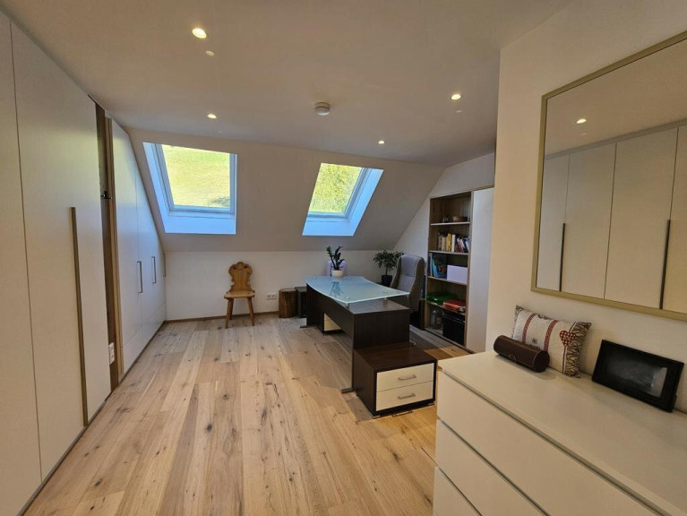 Eichen-Landhausdielen, 3-fach verglaste Fenster mit Raffstores sowie ein Kamin vom Ofenbauer sorgen für Behaglichkeit. Die exklusive Breitschopf-Küche mit Naturstein sowie ein integriertes Bussystem unterstreichen den hochwertigen Wohnstandard.