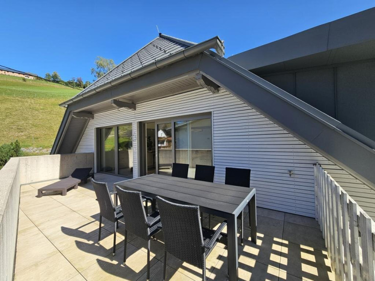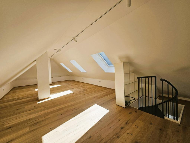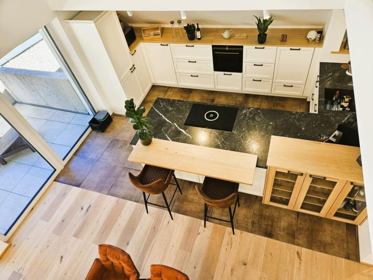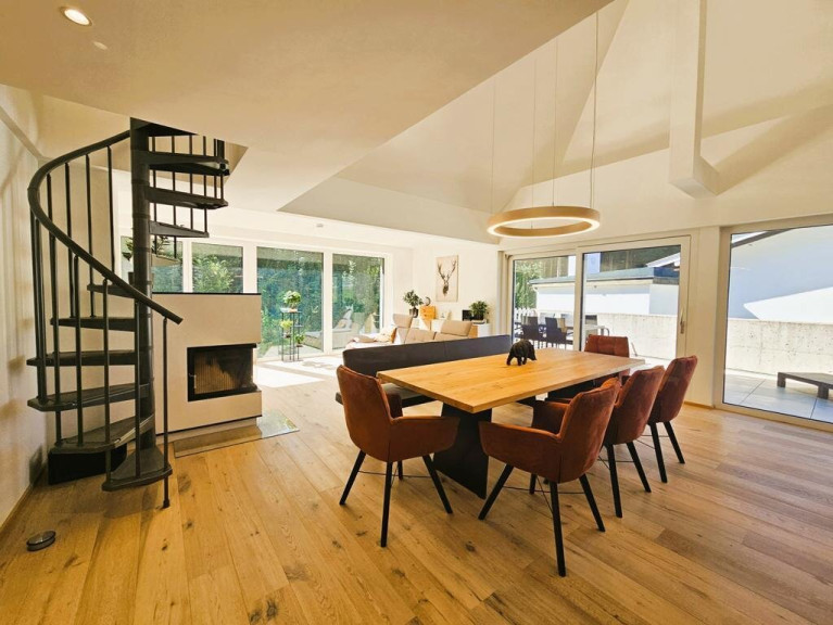 Im Obergeschoss erwartet Sie ein sonnendurchflutetes und sehr modernes Ambiente. Der großzügige Wohn-Ess-Kochbereich mit offener Galerie schafft ein Gefühl von Weite und verbindet sich harmonisch mit der großen Terrasse.