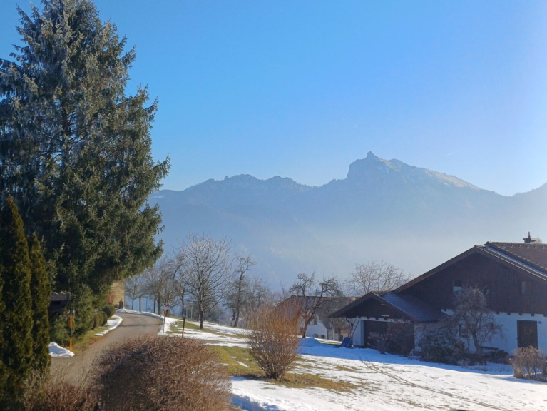 In herrlich ruhiger Lage mit traumhaftem Blick auf die umliegende Bergwelt sowie etwas Seeblick präsentiert sich diese großzügige Eigentumswohnung im 1. Obergeschoss eines kleinen, sehr gepflegten Wohnhauses.