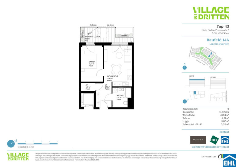 Im dritten Wiener Gemeindebezirk entsteht mit dem VILLAGE IM DRITTEN ein neues Stück Stadt – eines der größten Stadtentwicklungsgebiete Wiens. Auf über elf Hektar entwickelt die ARE Austrian Real Estate gemeinsam mit der Stadt Wien und dem wohnfonds_wien ein lebendiges, nahezu autofreies Quartier mit rund 2.000 Wohnungen, Büro- und Gewerbeflächen, Kinderbetreuung, Bildungseinrichtungen und Nahversorgung. Das grüne Herz bildet der über 2 Hektar große Bert-Brecht-Park –eine Oase für Erholung, Begegnung und Spiel. Alle Dächer, die nicht begehbar sind, werden begrünt. Sharing-Angebote, Einkaufsmöglichkeiten und Gastronomie liegen direkt vor der Haustüre. Nachhaltigkeit, kurze Wege und hohe Lebensqualität sind die Leitlinien dieses neuen Stadtviertels.